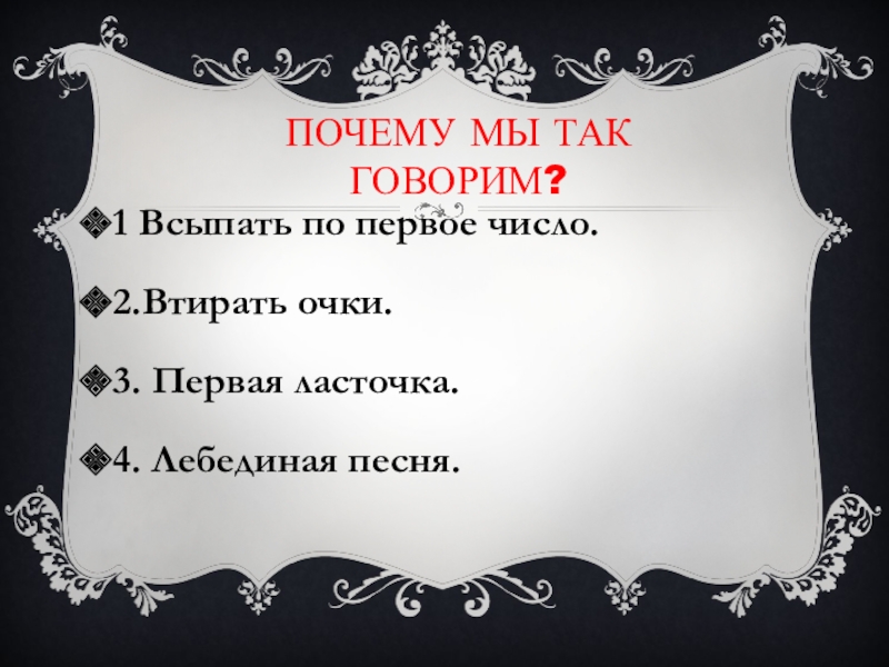 Почему мы так говорим?1 Всыпать по первое число.2.Втирать очки.3. Первая ласточка.4. Лебединая песня.