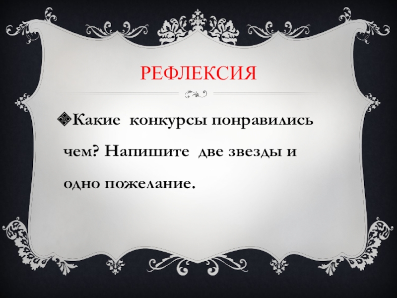 РефлексияКакие конкурсы понравились чем? Напишите две звезды и одно пожелание.