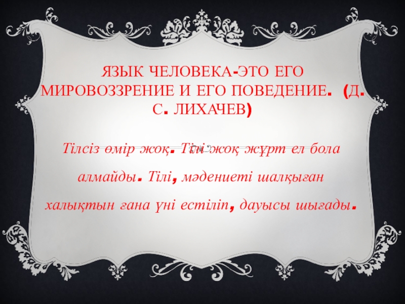 Язык человека-это его мировоззрение и его поведение. (Д.С. Лихачев)Тілсіз өмір жоқ. Тілі жоқ жұрт ел бола алмайды. Тілі, мәдениеті шалқыған халықтын ғана үні естіліп, дауысы шығады.