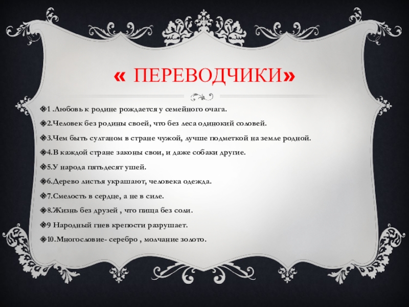 « Переводчики»1 .Любовь к родине рождается у семейного очага.2.Человек без родины своей, что без леса одинокий соловей.3.Чем