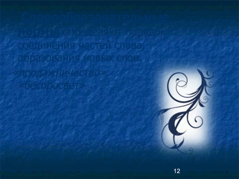 Слайд 12 Словообразовательные нормы определяют порядок соединения частей слова, образования новых слов.