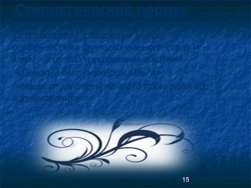 Слайд 15 Стилистические нормы определяют употребление языковых средств в соответствии с законами жанра,