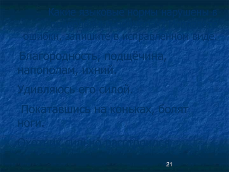 Слайд 21Какие языковые нормы нарушены в приведённых примерах? Исправьте ошибки, запишите в