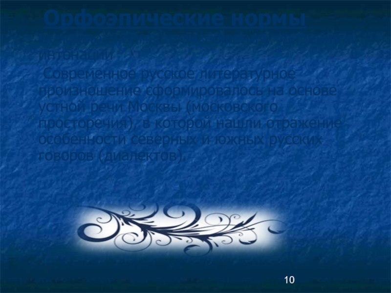 Слайд 10 Орфоэпические нормы включают нормы произношения, ударения и интонации