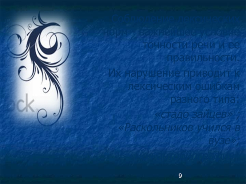 Слайд 9 Соблюдение лексических норм - важнейшее условие точности речи и ее правильности.