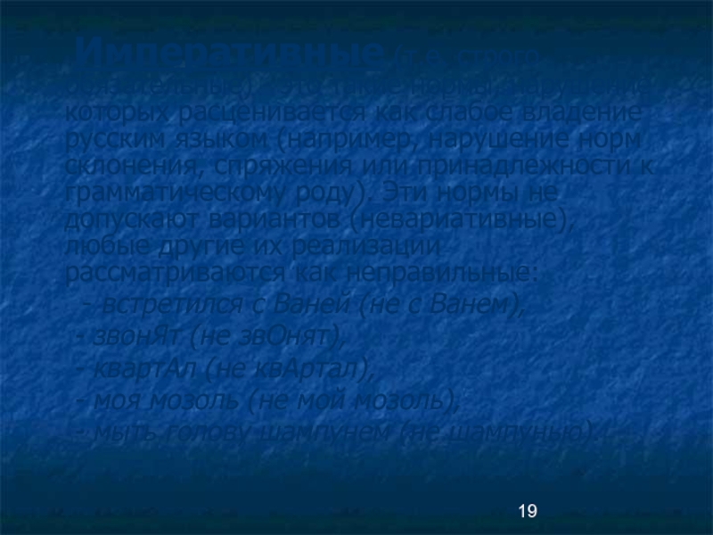 Слайд 19 Императивные (т.е. строго обязательные) - это такие нормы, нарушение которых расценивается