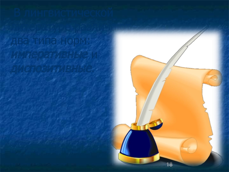 Слайд 18 В лингвистической литературе различают два типа норм: императивные и диспозитивные.