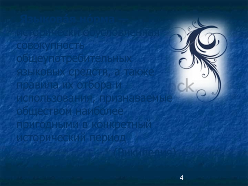 Слайд 4 Языкова́я но́рма — исторически обусловленная совокупность общеупотребительных языковых средств, а также