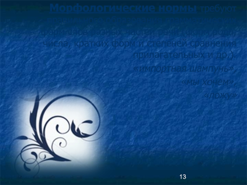 Слайд 13 Морфологические нормы требуют правильного образования грамматических форм слов разных частей речи