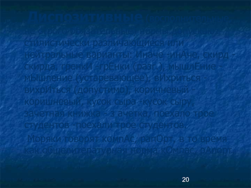 Слайд 20 Диспозитивные (восполнительные, не строго обязательные) нормы допускают стилистически различающиеся или нейтральные