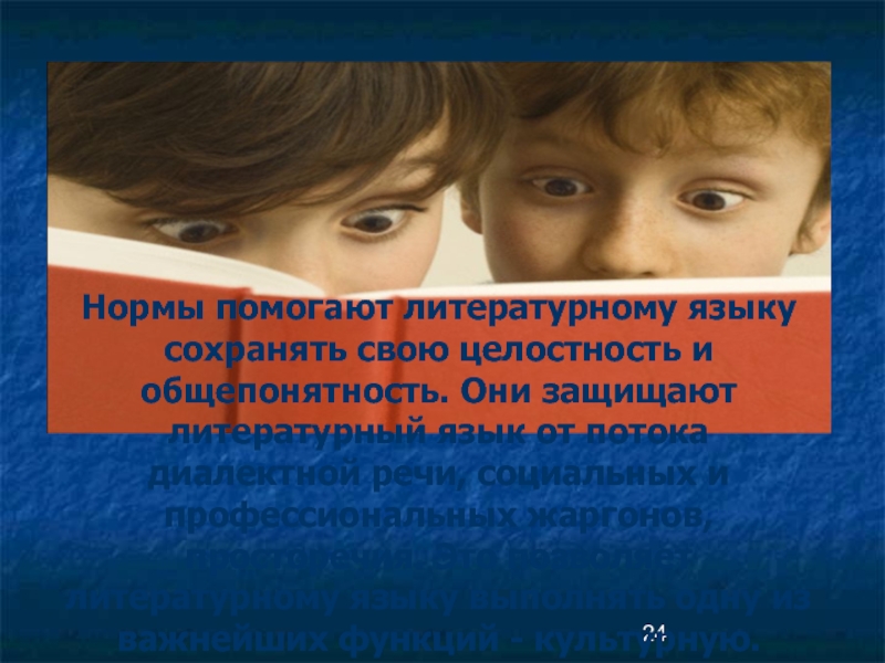 Слайд 24Нормы помогают литературному языку сохранять свою целостность и общепонятность. Они защищают