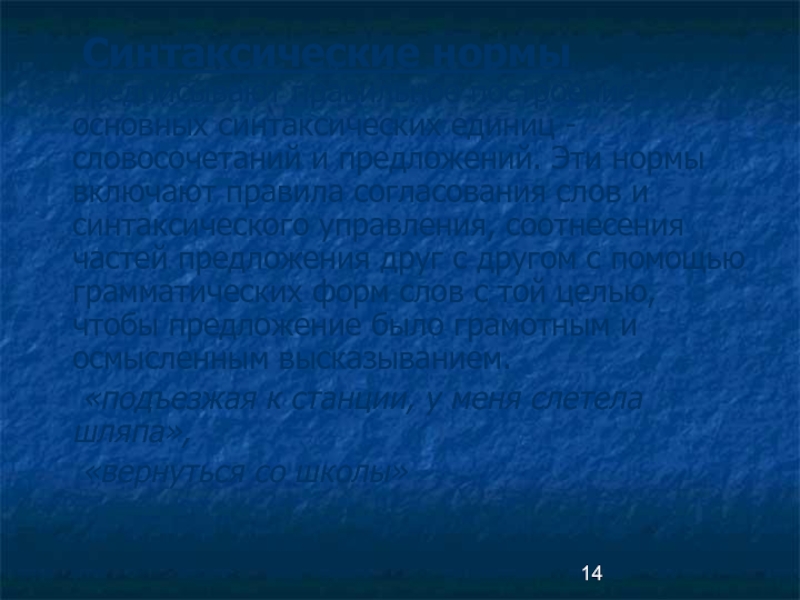 Слайд 14 Синтаксические нормы предписывают правильное построение основных синтаксических единиц - словосочетаний и