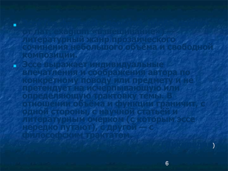 Слайд 6Эссе́ (из фр. essai «попытка, проба, очерк», от лат. exagium «взвешивание»)