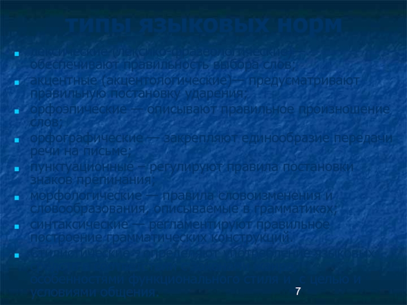 Стилистические - определяют употребление языковых средств в соответствии с законами жанра, особенностями функционального стиля и с целью и условиями общения.
