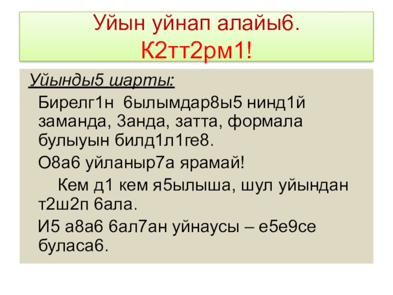 Слайд 15Уйын уйнап алайы6.
