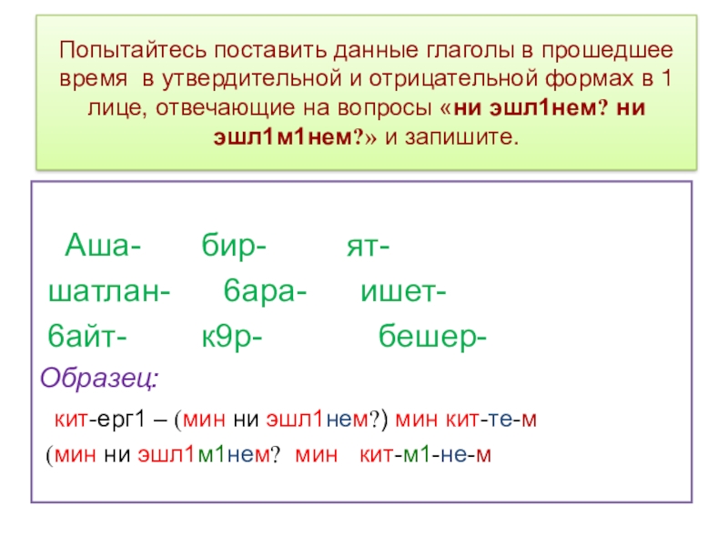 Слайд 8Попытайтесь поставить данные глаголы в прошедшее время в утвердительной и отрицательной
