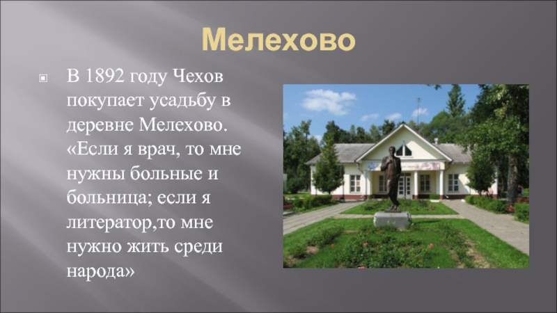 В 1892 году Чехов покупает усадьбу в деревне Мелехово. «Если я