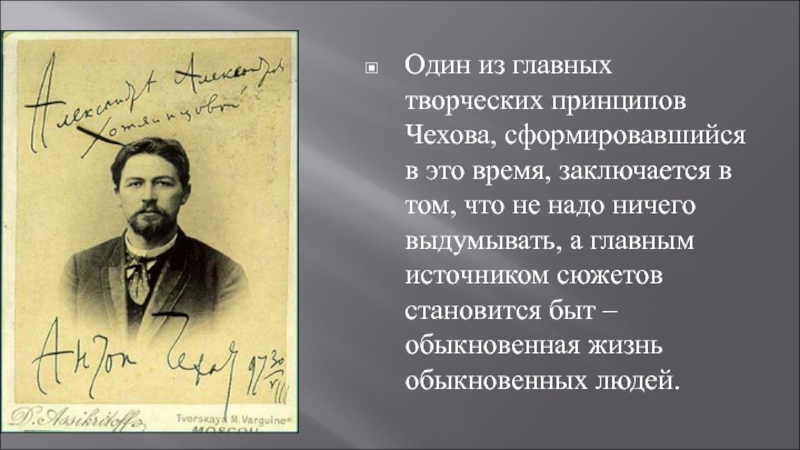 Один из главных творческих принципов Чехова, сформировавшийся в это время, заключается