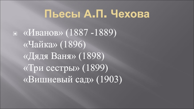 Классическая чеховская драматургия начинается с «Чайки» (1896 г.), премьера которой