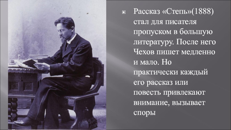 Рассказ «Степь»(1888) стал для писателя пропуском в большую литературу. После него