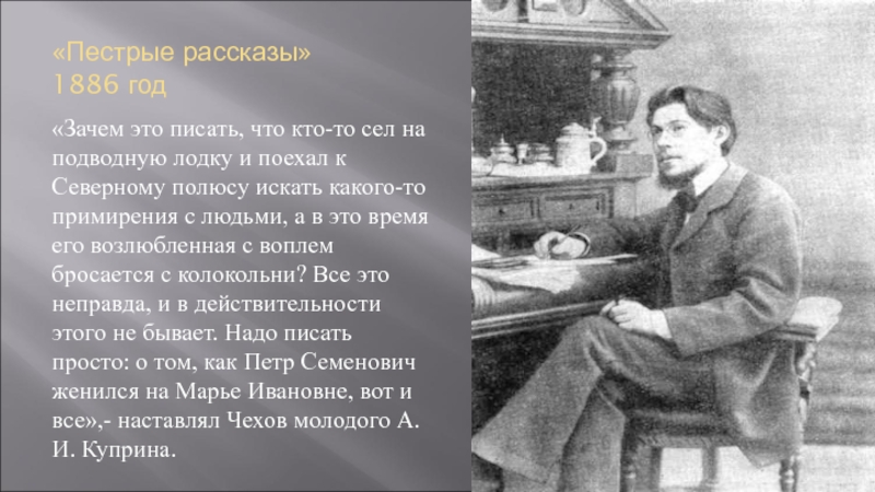 и поехал к Северному полюсу искать какого-то примирения с людьми, а в это время его возлюбленная с воплем бросается с колокольни? Все это неправда, и в действительности этого не бывает. Надо писать просто: о том, как Петр Семенович женился на Марье Ивановне, вот и все»,- наставлял Чехов молодого А.И. Куприна.