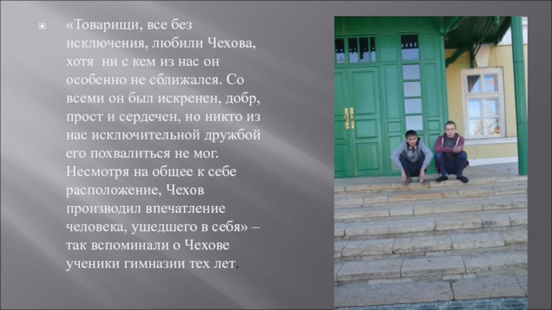 нас он особенно не сближался. Со всеми он был искренен, добр, прост и сердечен, но никто из нас исключительной дружбой его похвалиться не мог. Несмотря на общее к себе расположение, Чехов производил впечатление человека, ушедшего в себя» – так вспоминали о Чехове ученики гимназии тех лет.