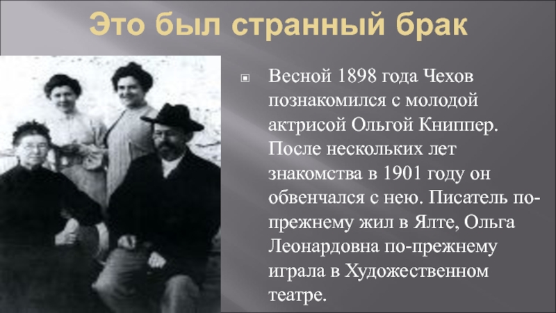 Ольгой Книппер. После нескольких лет знакомства в 1901 году он обвенчался с нею. Писатель по-прежнему жил в Ялте, Ольга Леонардовна по-прежнему играла в Художественном театре.