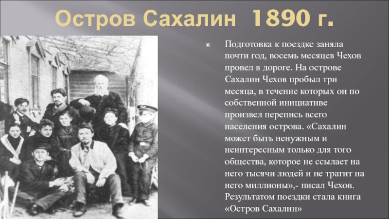 Чехов провел в дороге. На острове Сахалин Чехов пробыл три месяца, в течение которых он по собственной инициативе произвел перепись всего населения острова. «Сахалин может быть ненужным и неинтересным только для того общества, которое не ссылает на него тысячи людей и не тратит на него миллионы»,- писал Чехов. Результатом поездки стала книга «Остров Сахалин»