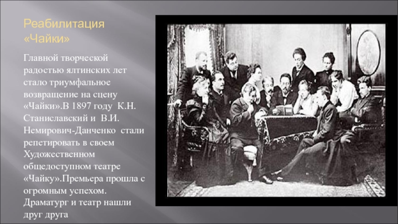 «Чайки».В 1897 году К.Н. Станиславский и В.И. Немирович-Данченко стали репетировать в своем Художественном общедоступном театре «Чайку».Премьера прошла с огромным успехом. Драматург и театр нашли друг друга
