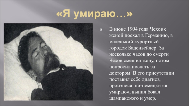 в маленький курортный городок Баденвейлер. За несколько часов до смерти Чехов смешил жену, потом попросил послать за доктором. В его присутствии поставил себе диагноз, произнеся по-немецки «я умираю», выпил бокал шампанского и умер.