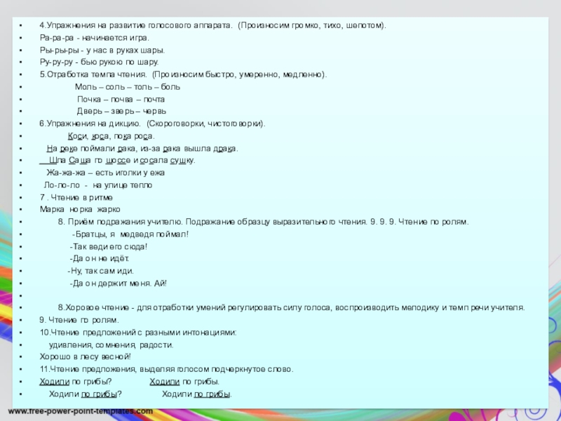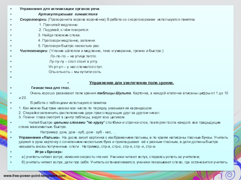 Слайд 10Упражнения, способствующие формированию правильного чтения: