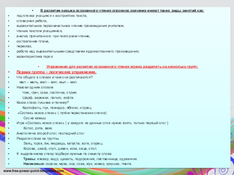 Слайд 16В развитии навыка осознанного чтения огромное значение имеют такие виды занятий