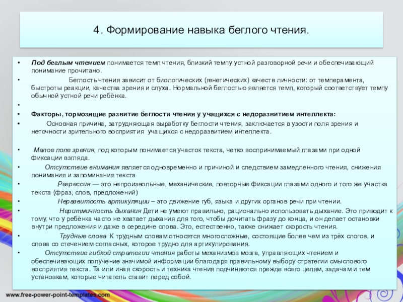 специальной (коррекционной) школе для детей с недоразвитием интеллекта является формирование правильного, беглого и осознанного чтения. Согласно программным требованиям, формирование выразительности чтения начинается с 3-го класса, с момента перехода к чтению целыми словами,