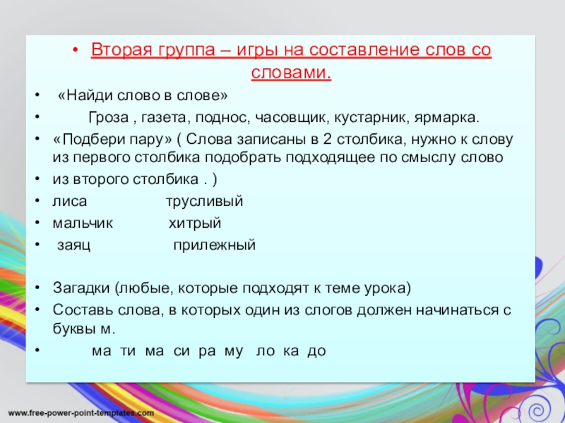 Слайд 17Вторая группа – игры на составление слов со словами.