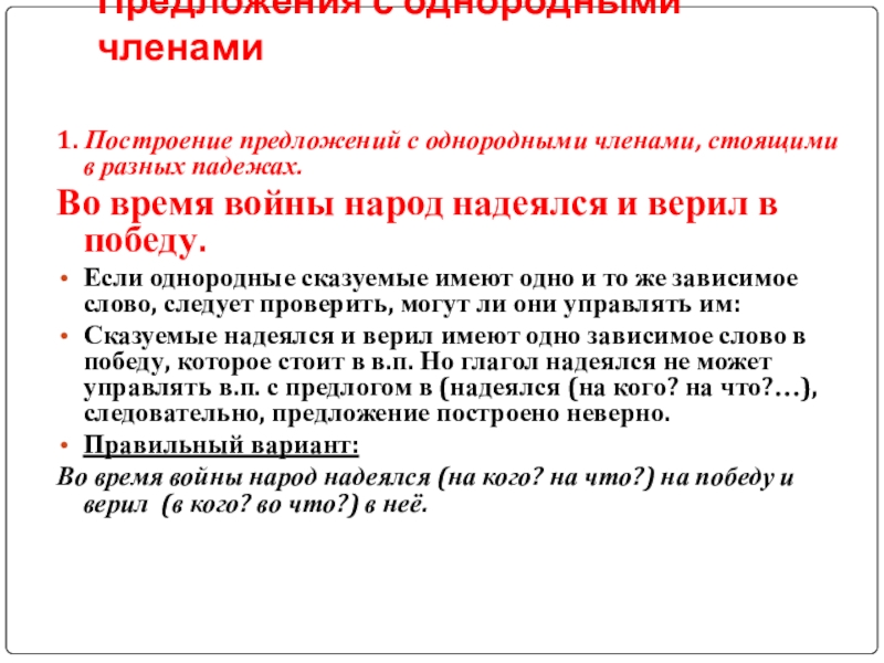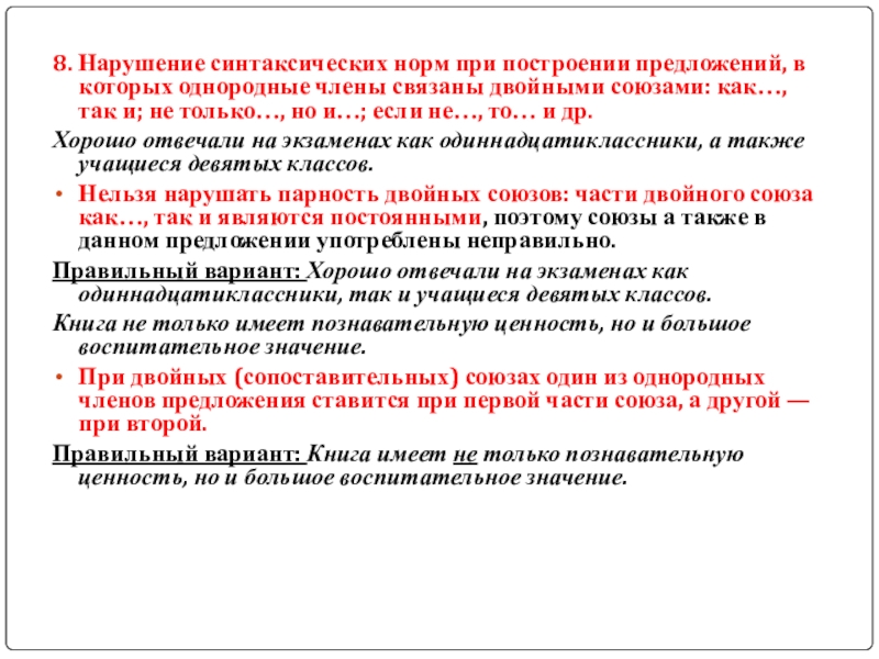 Слайд 98. Нарушение синтаксических норм при построении предложений, в которых однородные члены