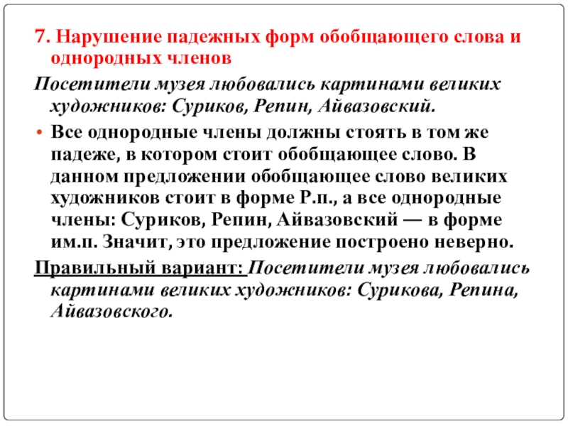 Слайд 87. Нарушение падежных форм обобщающего слова и однородных членов