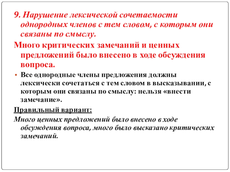 Все однородные члены предложения должны лексически сочетаться с тем словом в высказывании, с которым они связаны по смыслу: нельзя «внести замечание».