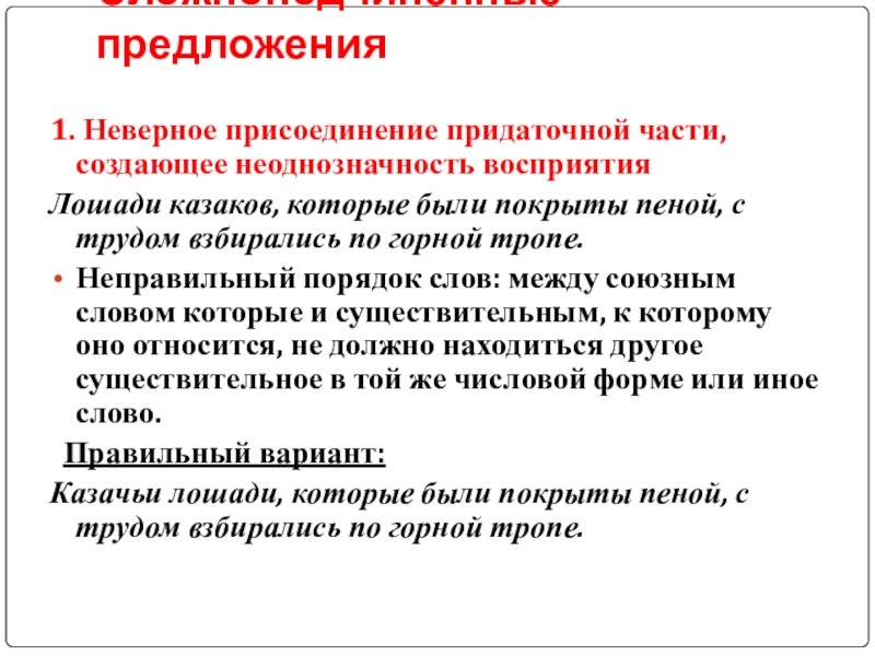 1. Неверное присоединение придаточной части, создающее неоднозначность восприятия