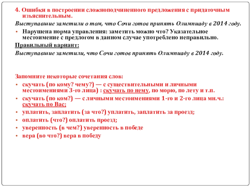 Слайд 174. Ошибки в построении сложноподчиненного предложения с придаточным изъяснительным.