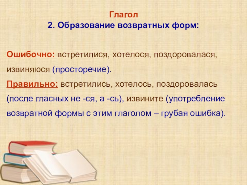 Ошибочно: встретилися, хотелося, поздоровалася, извиняюся (просторечие).
