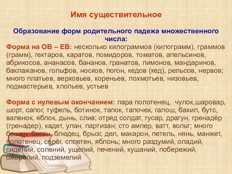 несколько килограммов (килограмм), граммов (грамм), гектаров, каратов, помидоров, томатов, апельсинов, абрикосов, ананасов, бананов, гранатов, лимонов, мандаринов, баклажанов, гольфов, носков, погон, кедов (кед), рельсов, нервов;
