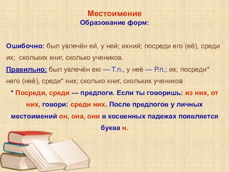 * Посреди, среди — предлоги. Если ты говоришь: из них, от них, говори: среди них. После предлогов у личных местоимений он, она, они в косвенных падежах появляется буква н.