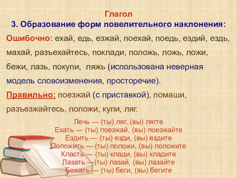 ездь, махай, разъехайтесь, поклади, положь, ложь, ложи, бежи, лазь, покупи, ляжь (использована неверная модель словоизменения, просторечие).