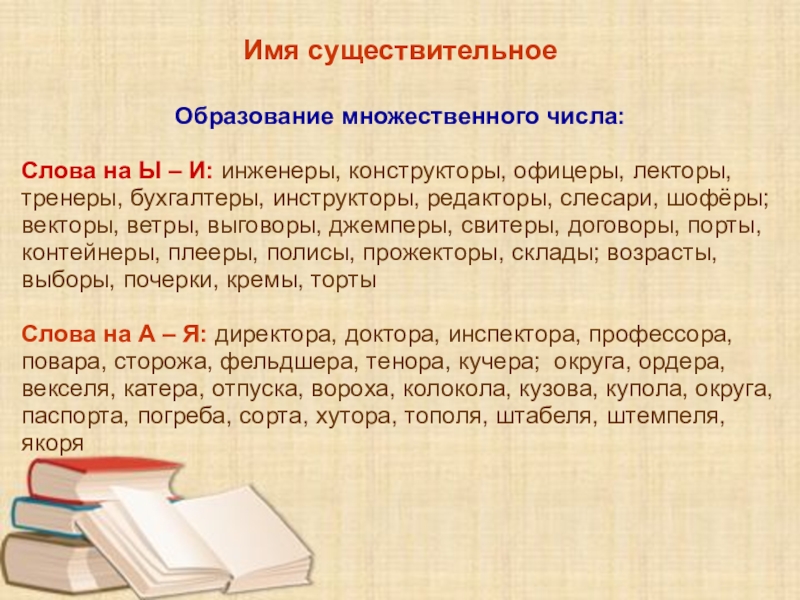 офицеры, лекторы, тренеры, бухгалтеры, инструкторы, редакторы, слесари, шофёры; векторы, ветры, выговоры, джемперы, свитеры, договоры, порты, контейнеры, плееры, полисы, прожекторы, склады; возрасты, выборы, почерки, кремы, торты