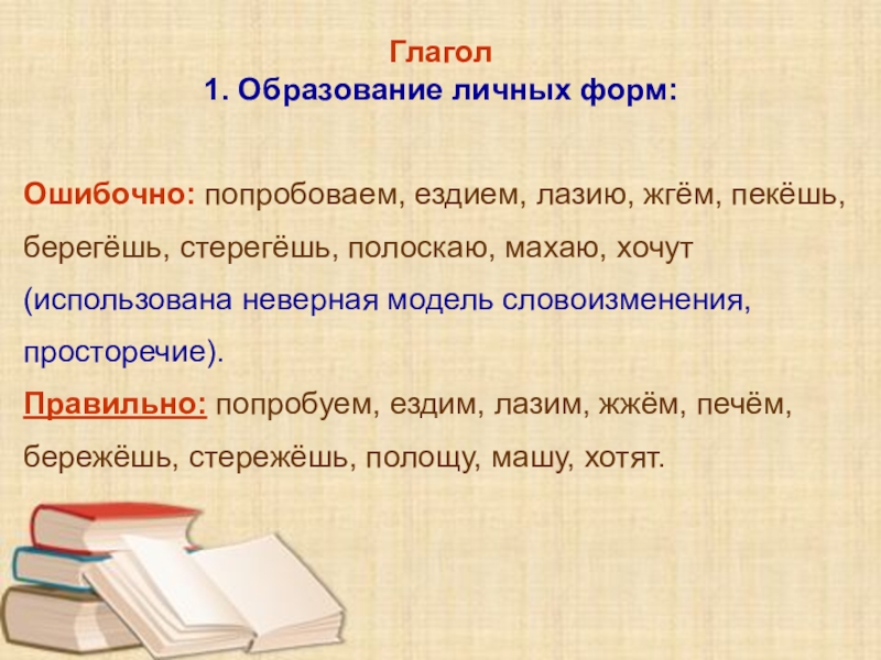 полоскаю, махаю, хочут (использована неверная модель словоизменения, просторечие).