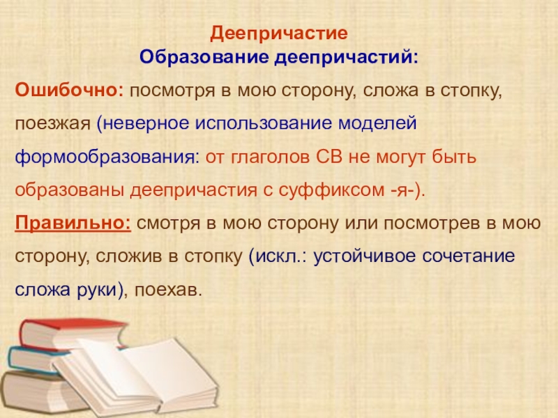 Ошибочно: посмотря в мою сторону, сложа в стопку, поезжая