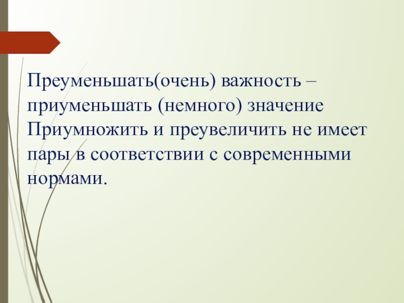 Слайд 12Преуменьшать(очень) важность – приуменьшать (немного) значение