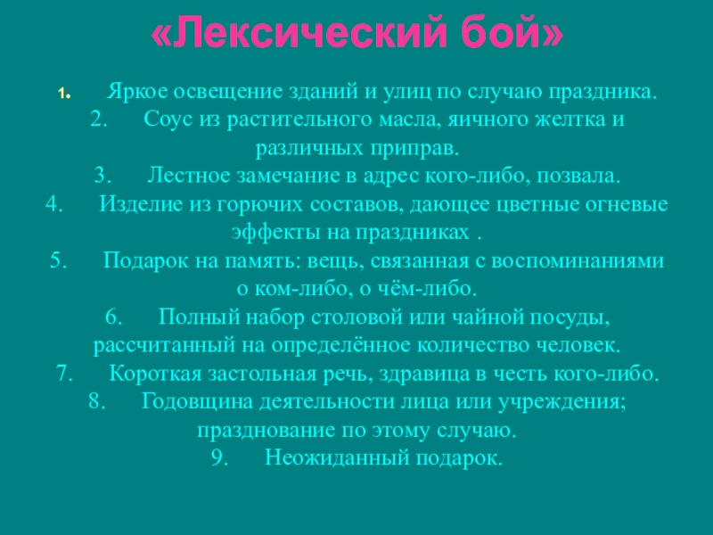 Слайд 19«Лексический бой» 1. Яркое освещение зданий и улиц
