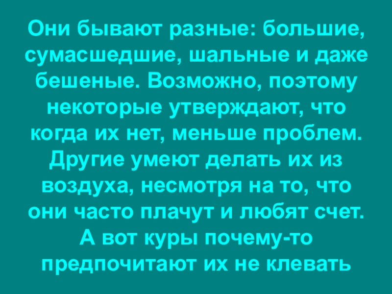 Слайд 17Они бывают разные: большие, сумасшедшие, шальные и даже бешеные. Возможно, поэтому