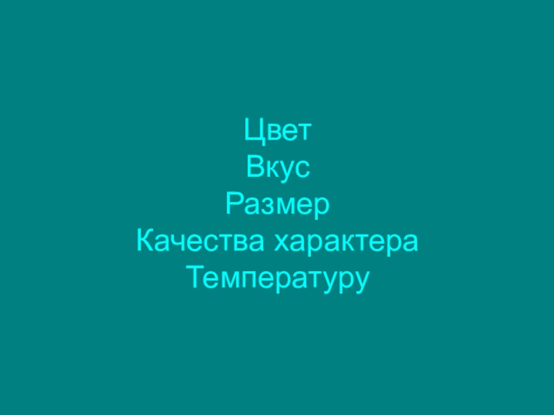 Слайд 5Цвет Вкус Размер Качества характера Температуру